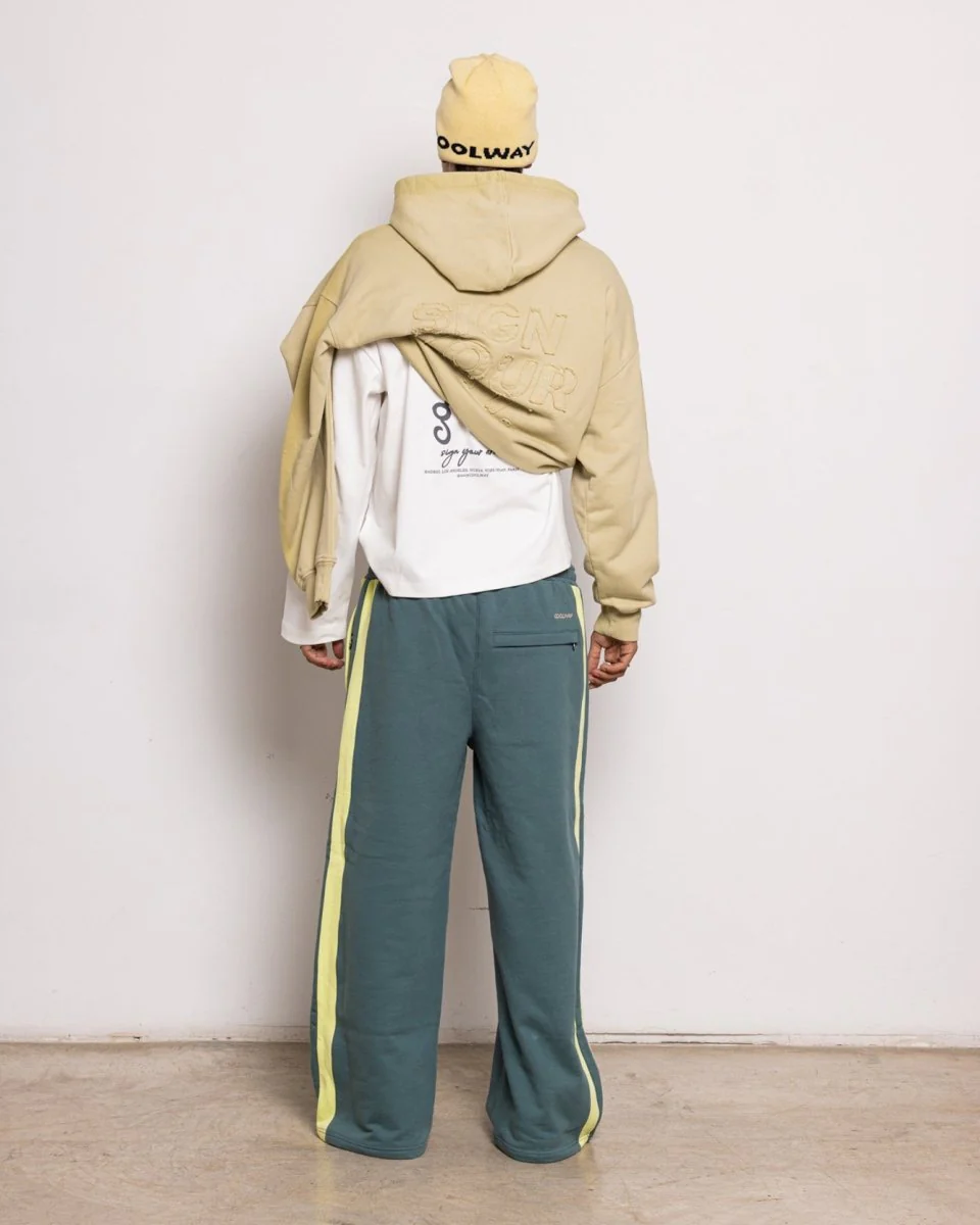 Pantalones deportivos holgados de pernera ancha confeccionados en denso tejido polar 100 % algodón (480 g/m²) para mayor estructura y calidez. Perfil lateral de líneas limpias con dos rayas en las piernas y un refinado bordado de doble logotipo para un sutil toque de marca.