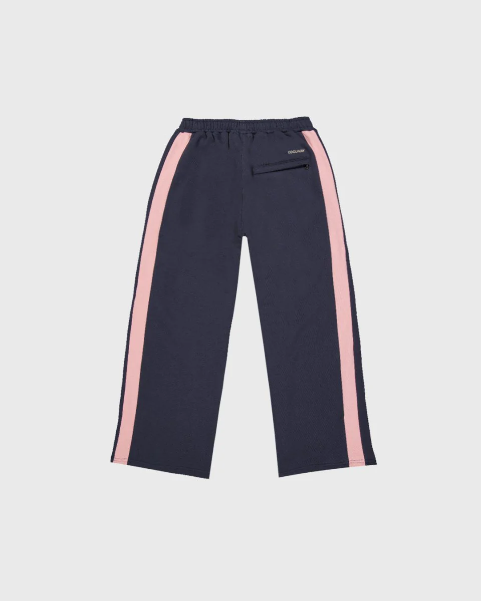 Pantalones deportivos holgados de pernera ancha confeccionados en denso tejido polar 100 % algodón (480 g/m²) para mayor estructura y calidez. Perfil lateral de líneas limpias con dos rayas en las piernas y un refinado bordado de doble logotipo para un sutil toque de marca.